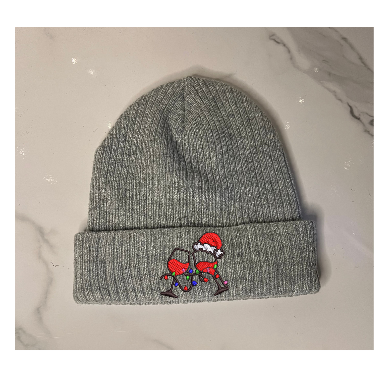 'Wine Glasses with Christmas Hat and Lights' Embroidered Beanie